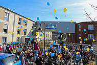 Mit gelben und blauen Ballons setzten Bewohner*innen, Mitarbeiter*innen und Ordensschwestern des Seniorenzentr…