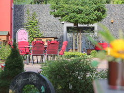 Der vordere Bereich dient der Ruhe und Entspannung. Mehrere Sitzgelegenheiten und ein kleiner Brunnen sorgen für die entsprechende Atmosphäre.