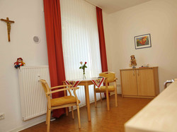 Die Zimmer sind möbliert mit Pflegebett, Kleiderschrank, Kommode, Nachttisch, Tisch und Stuhl. Wir begüßen es sehr, wenn Sie Ihr Zimmer mit persönlichen Gegenständen einrichten. In diesem Fall verbleiben lediglich das Pflegebett und der Nachttisch im Bewohnerzimmer.