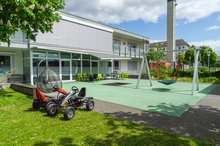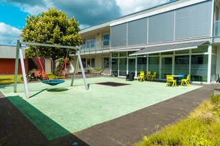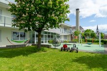 Das Außengelände ist den Menschen und ihren Bedürfnissen entsprechend einladend gestaltet und bietet Platz zum Verweilen und Entspannen.