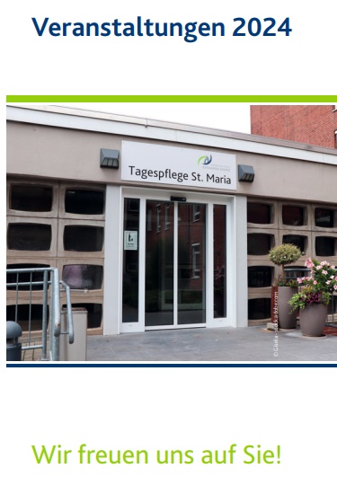 Wenn Ihnen als älterem oder betreuungsbedürftigem Menschen zu Hause die Ansprache und der soziale Kontakt fehlen, finden Sie in unserer Tagespflege St. Maria geselliges Leben und gemeinschaftliche Aktivität - ohne auf das Einschlafen im eigenen Bett verzichten zu müssen. Die Tagespflege steht unseren Gästen montags bis freitags von 8 bis 16 Uhr zur Verfügung und ist ein wirksames Mittel gegen Einsamkeit, Langeweile und das Verkümmern von Fähigkeiten durch mangelnde Anregung. Auch für betreuende Angehörige ist sie damit eine große Entlastung und Unterstützung.