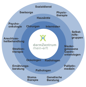 Im Darmzentrum Rhein-Erft zwischen Köln und Bonn sind mehrere medizinische Fachrichtungen eng miteinander vernetzt. So entsteht eine optimale Versorgung der Patienten durch Bündelung hoher Kompetenz, intensiver und schneller Kommunikation sowie gemeinsamer Dokumentation der spezialisierten verschiedenen Fachrichtungen.