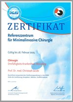 Durch gezielte Spezialisierung und Einführung modernster laparoskopischer Techniken sind wir anerkanntes Referenzzentrum für Minimal Invasive Chirurgie. die Zertifizierung durch die Deutsche Gesellschaft für Allgemein- und Viszeral-chirurgie (DGAV) bestätigt unserer Chirurgie Qualitätsstandards auf höchstem Niveau.