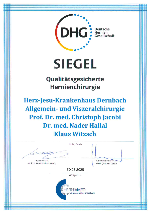Unsere Hernienchirurgie hat von der Deutschen Herniengesellschaft das Siegel für Qualitätsgesicherte Hernienchirurgie erhalten. Für Sie als Patient bedeutet dies ein besonderes Plus an Sicherheit. Wir streben weiter die Zertifizierung als zertifiziertes Hernienzentrum an.