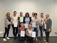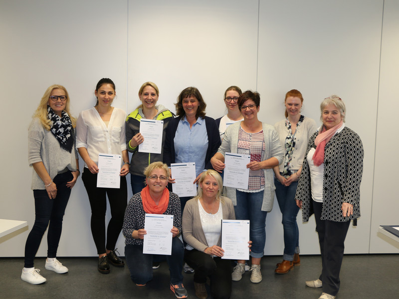Zum Foto (v. l.): Ute Justen (Leitung Katharina Kasper Akademie), Simone Jüngster, Bianca Toma, Ines Günther, Susanne Simon, Ulrike Eckhoff, Janina Schmitz, Katja Hübinger, Elena Hage (Bildungsmanagement Katharina Kasper Akademie), Martina Bretz (Kursleitung Staatlich anerkannte Weiterbildungen)