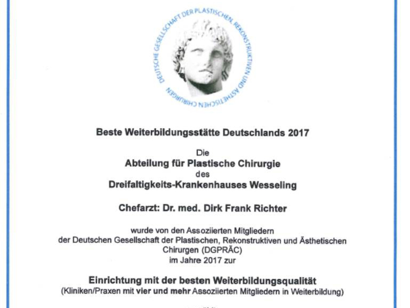Die Plastische Chirurgie des Dreifaltigkeits-Krankenhauses Wesseling ist von der Deutschen Gesellschaft der Plastischen, Rekonstruktiven und Ästhetischen Chirurgie (DGRPÄC) im September 2017 bundesweit als Einrichtung mit der besten