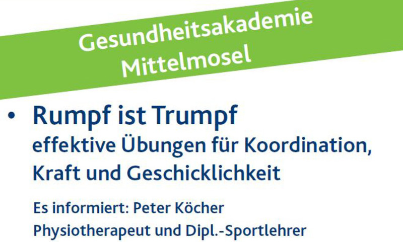 Am Montag, 5. Februar, geht es in Traben-Trarbach in der Gesundheitsakademie Mittelmosel (ehem. Anna-Henrietten-Stift, Am Bahnhof 58) um den Rumpf. Wie können Körperhaltung, Koordination, Kraft und Geschicklichkeit gefördert werden? Wie können Übungen ohne großen Aufwand und mit möglichst effektivem Trainingsergebnis in den Alltag integriert werden?
