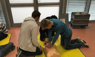 Zuerst gab Dr. Lopp eine kurze Einführung zum Thema Kreislauf, Herzstillstand, korrekter Notruf und Herzdruckmassage. Schnell ging es dann an die praktische Umsetzung. Mithilfe von Reanimationspuppen konnten alle anwesenden Schülerinnen und Schüler die Herzdruckmassage selbst intensiv üben. Damit die Schüler konsequent mit der optimalen Frequenz von ca. 100-120 pro Minute drücken konnten, wurden während des Trainings bekannte und eingängige Pop-Songs eingespielt, die genau diesen Rhythmus haben, so z. B. "Highway to Hell" oder "Staying alive".