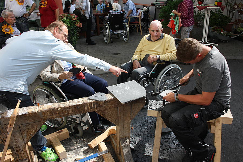 Die Firma Spettschlösser stellte ihr Material vor dem Haus auf und so konnten Bewohner, Gäste oder Mitarbeiter selbst versuchen aus Schieferplatten mit entsprechenden Werkzeugen, Herzen zu klopfen. Manch einer konnte sich davon überzeugen, dass es gar nicht so einfach ist, mit einem Dachdeckerhammer Schiefer in Form zu bringen. Die Firma Rickenbach hatte einen hübschen Stand mit Blumen und Pflanzen, ein Botaniker präsentierte fleischfressende Pflanzen und Opel Fröhlich stellt einige Fahrzeuge aus.