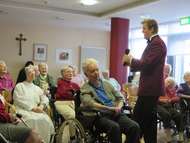 „Viele Bewohner sind früher regelmäßig in Opern oder Operetten gegangen und haben heute leider nicht mehr die Möglichkeit.“ So Andrea Hecke-Esch vom Vorstand des Freundeskreises. Aus diesem Grund besuchte der ungarische Tenor György Vajk, der einige Jahre im Operettenhaus Budapest arbeitet und bereits Engagements in internationalen Häusern hatte, die Bewohner der Einrichtungen. Im Gepäck hatte er einen bunten Strauß an Melodien. Von Operette bis Musical und einigen Evergreens war alles dabei. Auch viele bekannte Melodien, bei denen fröhlich mitgesungen werden konnte. Ganz spontan wagte der Sänger ein Tänzchen mit einer der Bewohnerinnen zum Walzer im ¾ Takt. Das Lächeln und der Applaus waren eindeutig: Es war ein wunderschöner Nachmittag der allen noch lange in Erinnerung bleiben wird.