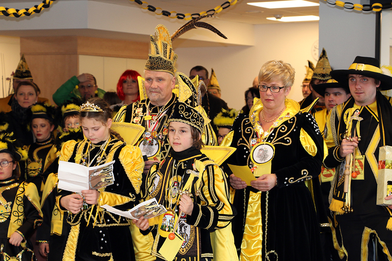 Der ehrenamtliche Mitarbeiter Helmut Reis verkürzte die Wartezeit auf den Einzug der KKG im Seniorenzentrum mit einem Potpourri aus klassischen Karnevals- und Stimmungsliedern. Die Tollitäten wurden bereits freudig von den Bewohnerinnen und Bewohnern des Seniorenzentrums Mittelmosel erwartet. Schon seit Wochen bereiteten sich die Senioren auf den hohen Besuch vor. Mit selbstgebastelten Girlanden in den Vereinsfarben des KKG – Schwarz und Gelb – dekorierten sie das Seniorenzentrum Mittelmosel und verkleideten sich mit bunten Perücken und Hüten. Um sich vorab auf die Veranstaltung einzustimmen gab es Kuchen und - wie es der Tradition entspricht - Berliner.