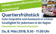 Mit einem neuen Angebot startet das Lokale Gesundheitszentrum Mittelmosel in Traben-Trarbach ab März. Am zweiten Donnerstag des Monats sind alle Interessierten eingeladen zu einem Quartiersfrühstück. Ziel ist es, in der Region, hier benannt als Quartier, einen Rahmen zu bieten für den geselligen Austausch zwischen nahen und nicht ganz so nahen Nachbarn. Menschen, die Lust haben auf gute Gespräche und eine schöne Gemeinschaft können sich hier zu einem leckeren Frühstück treffen.