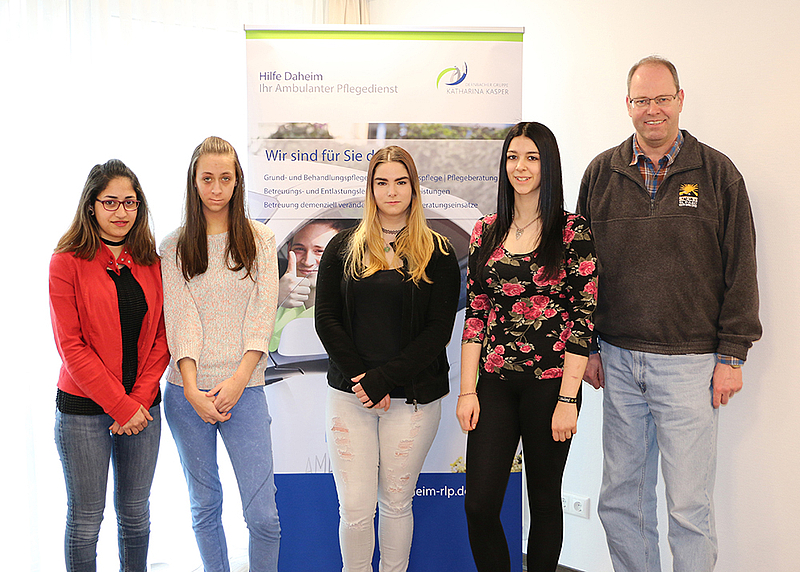 Im Rahmen der Aktionstage zum Pflegeberuf lud die Zukunftsallianz Cochem-Zell Schülerinnen und Schüler, Wiedereinsteiger und Interessierte in das Seniorenzentrum Mittelmosel, um sich über den Pflegeberuf zu informieren. Unter dem Motto „Wir l(i)eben Pflege – Kein Job, sondern eine Aufgabe“ konnten sich die Teilnehmer einen Überblick über die Aufgaben und den Arbeitsalltag von Pflegekräften verschaffen. Vier Schülerinnen der Integrierten Gesamtschule Zell nahmen gemeinsam mit ihrem Lehrer Dirk Muscheid an der Informationsveranstaltung teil, bei der Sandra Mindermann von der Pflegeberatung des ambulanten Pflegedienstes Hilfe Daheim den Träger der Senioreneinrichtung, die Katharina Kasper ViaSalus GmbH, vertrat.