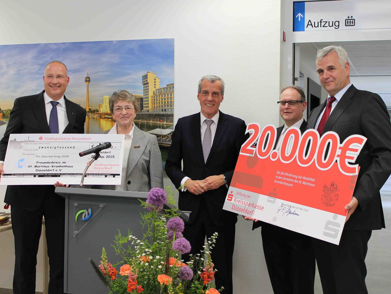Zum Bild: Arndt M. Hallmann, Vorsitzender des Vorstandes Stadtsparkasse Düsseldorf (links) und Johann-Peter Ingenhoven, Vorstandsmitglied der Kreissparkasse Düsseldorf (rechts) bei der Scheckübergabe an PD Dr. Herbert F. Durwen, Chefarzt der Geriatrie (2. v.r.) sowie an Hildegard Kempkes, Vorsitzendes des Freundeskreises St. Martinus e. V. (2. v.l.) und Peter Fröhlich, Vorsitzender der St. Martinus-Stiftung (mitte).