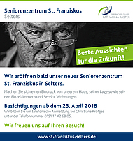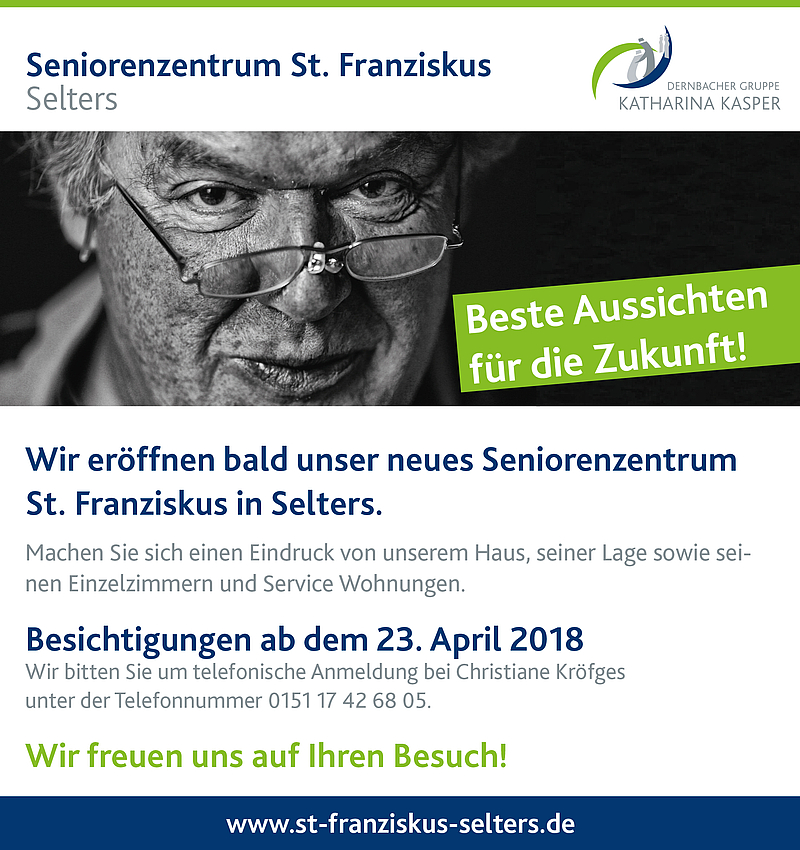 Die Fertigstellung unseres Seniorenzentrums St. Franziskus in Selters nähert sich mit großen Schritten. In wenigen Monaten werden schon die ersten Bewohner in die Einrichtung einziehen können, die neben der vollstationären Pflege auch eine Tagespflege, einen ambulanten Pflegedienst und Service Wohnungen für Senioren anbieten wird. Damit sich Interessierte schon jetzt einen Eindruck von dem Haus, seiner Lage sowie den 85 Einzelzimmern und den 13 Service Wohnungen machen können, werden ab dem 23. April Besichtigungen angeboten. Interessierte können mit der künftigen Einrichtungsleitung, Christiane Kröfges, unter der Telefonnummer 0151 17426805 einen Termin vereinbaren.