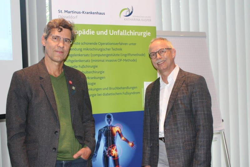 Bei strahlendem Oktobersonnenschein waren rund 50 Zuhörerinnen und Zuhörer am Dienstagnachmittag, 16. Oktober, in die Düsseldorfer Handwerkskammer gekommen, um sich beim Chefarzt der Orthopädie und Unfallchirurgie, Dr. med. Wolfang Court, und seinem Leitenden Oberarzt, Dr. med. Andreas Olk, über moderne Behandlungsmethoden rund um das Thema Knie zu informieren.