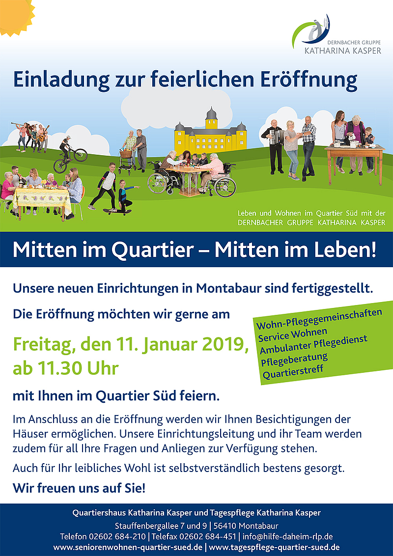 Am 11. Januar feiern wir dort ab 11.30 Uhr die Eröffnung unserer neuen Wohn- und Pflegeeinrichtungen und unseres Quartierstreffs. Nach einem Gottesdienst und den offiziellen Grußworten bieten wir Ihnen die Möglichkeit, sich über unsere neuen Einrichtungen und ihre innovativen Angebote und Konzepte zu informieren.