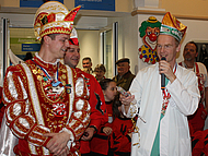 Passend zum Motto von Prinz Sebastian I.:“Hück fiere Jroos und Klein, janz Wesseling is `ne Verein“ nahmen feiernde Mitarbeiterinnen und Mitarbeiter die Wesselinger Tollitäten in der Eingangshalle des Krankenhauses in Empfang und stimmten lautstark das beliebte Prinzenlied :“Einmol Prinz zo sin…“ an.