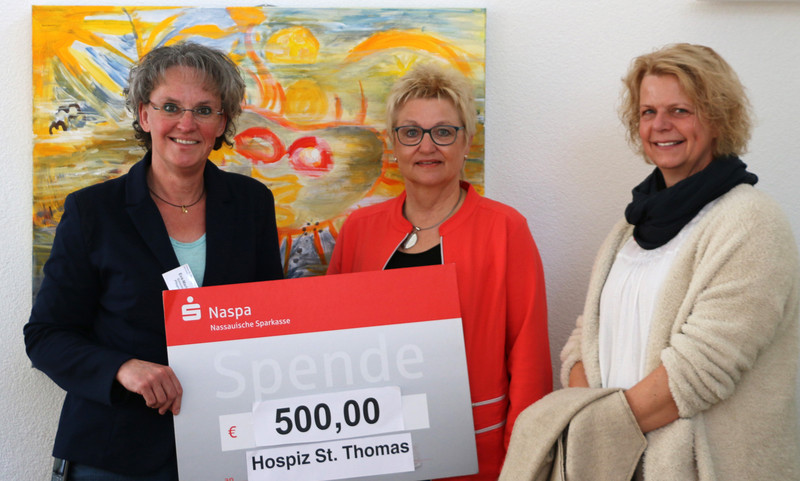 Bildunterschrift: Hospizleiterin Eva-Maria Hebgen mit Jutta Schmidt und Martina Haas bei der Spendenübergabe im Hospiz.