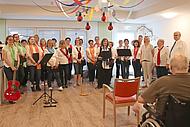 Für einen farbenfrohen Einstieg in die warme Jahreszeit sorgte der Chor "Klangfarben" aus Marienrachdorf. Am 2. Juni verzauberte er die zahlreich anwesenden Bewohnerinnen und Bewohner des Seniorenzentrums mit einem bunten Strauß fröhlicher Melodien. Bei strahlendem Sonnenschein und heißen Temperaturen war nicht nur Zuhören sondern auch Mitmachen angesagt! Viele Bewohner nutzten die Gelegenheit, um bei bekannten Klängen leise mitzusummen oder auch lautstark in den Refrain einzusteigen. Zwischendrin gab es zum Abkühlen neben kurzen Geschichten und vorgetragenen Gedichten erfrischende Getränke. Begeistert wurde im Anschluss Beifall gezollt!
