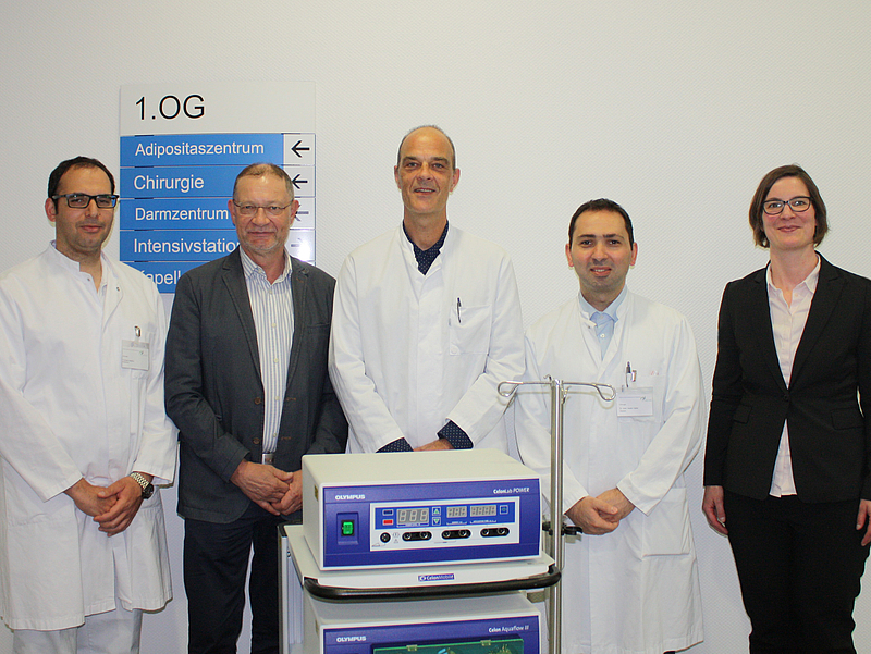 (v. l. n. r.) Chirurg Dr. med. Thomas Vasiliou, Vorsitzender des Fördervereins Dr. Gerd Wolter, Chefarzt der Chirurgie Professor Dr. med. Christoph A. Jacobi, Schilddrüsenexperte Dr. med. Nader Hallal, Kaufmännische Direktorin Alexandra Krause