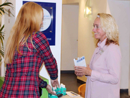 Zum Bild: Hygienefachkraft Alexandra Mehrländer (rechts) erklärt einer Besucherin die richtige Händedesinfektion