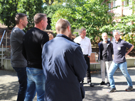 BU: Mitarbeiterinnen und Mitarbeiter der Fachklinik testen selbst die Übungen des Achtsamkeits- und Bewegungspfads.