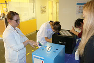 In diesem Jahr hatte Frau Friebel-Menten an ihrem Stand im Foyer des Krankenhauses tatkräftige Unterstützung von Anke Weinz, Pflegedienstleitung im benachbarten Seniorenzentrum Mittelmosel, und Christian Deutsch von der Firma Schülke. Mit einem speziellen Schaukasten, der sogenannten „Black Box“, überprüften sie die Gründlichkeit der Händedesinfektion der zahlreichen Teilnehmer. Zunächst desinfizierten die Besucher ihre Hände, wie sie es gewohnt sind. Frau Friebel-Menten, Frau Weinz und Herr Deutsch gaben währenddessen noch einmal Hinweise, worauf besonders zu achten ist: 30 Sekunden lang die Hände einreiben, bis sie wieder trocken sind. Daumen und Fingerspitzen nicht vergessen. Danach wanderten die Hände in die Black Box, wo spezielles Licht die nicht benetzten Hautstellen zum Vorschein brachte. Durch diese Selbstkontrolle sahen die Teilnehmer die Stellen, denen sie in Zukunft noch mehr Aufmerksamkeit schenken müssen.