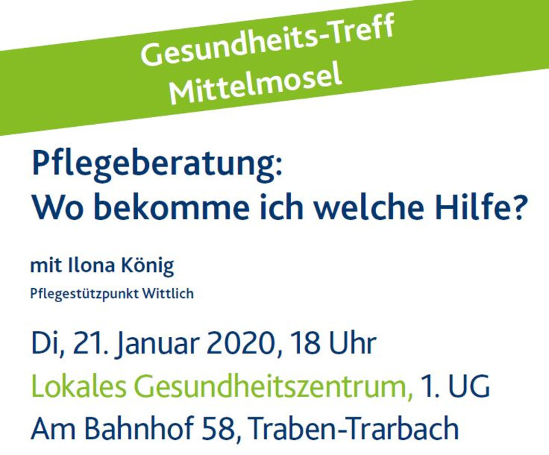 Das Lokale Gesundheitszentrum in Traben-Trarbach lädt herzlich zum nächsten Gesundheits-Treff ein: Ilona König vom Pflegestützpunkt in Wittlich, referiert zum Thema: