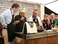 Zum Jubiläum der Werkstatt für Menschen mit einer psychischen Behinderung gab es bei Prospex eine große Überraschung: Sternekoch Stefan Marquard war der Star des Tages. „Wir kochen unser Festmenü" lautete das Motto im großen Festzelt an der Laakstraße. Die beiden Prospex-Geschäftsführer Martin Minten und Edgar Johnen standen im Kochduell genauso am Herd wie Werkstattleiter Salvatore Bianco und Markus Kremers, Technischer Leiter.