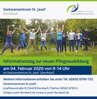 Der Informationstag findet am 4.Februar von 9-14 Uhr im Seniorenzentrum St. Josef, Josefshausstraße 8, 56428 Dernbach statt. Das Seniorenzentrum bittet um eine Anmeldung bis zum 3. Februar bei Frau Julia Knopp (freigestellte Praxisanleiterin): Tel.: 02602 6700155 / j.knopp@st-josef-dernbach.de