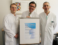 Zum Bild: Dr. med. Matthias Schlensak, Chefarzt der Allgemein- und Viszeralchirurgie (mitte) freut sich gemeinsam mit seinen Oberärzten Dr. med. Peter Kirchmeyer (links) und Dr. med. Dmitrij Dajchin (rechts) über die Auszeichnung als Kompetenzzentrum für Hernienchirurgie.