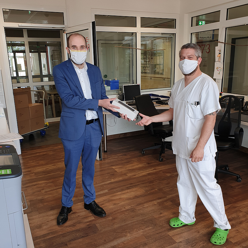 Nicht nur kulinarische Highlights warteten auf unsere Mitarbeiter. Seit den Morgenstunden besuchten Tim Plaggenborg und sein Stellvertreter Matthias Dworaczek unsere Pflegekräfte auf den Stationen und in den Funktionseinheiten. Mit im Gepäck hatten die beiden Vertreter der Pflegedirektion stylische Thermosflaschen aus Edelstahl, von ihnen auch mit einem Augenzwinkern als „Hydrationsmittelspender“ bezeichnet, die sie zusammen mit einem riesengroßen „Danke“ überreichten.