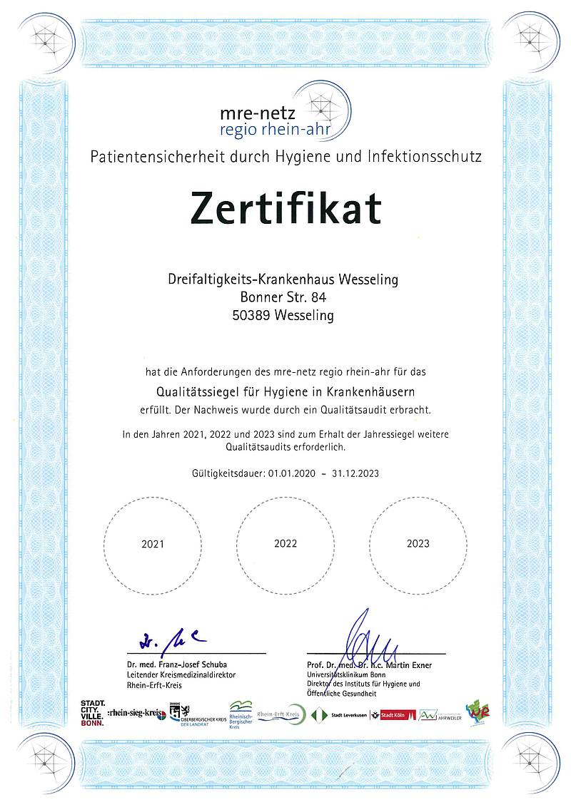Bonn, 15. September 2020 – Das mre-netz regio rhein-ahr hat heute das „Qualitätssiegel für Krankenhäuser 2020 -2023“ an 85 medizinische Einrichtungen in der Region verliehen, darunter auch das Dreifaltigkeits-Krankenhaus in Wesseling.