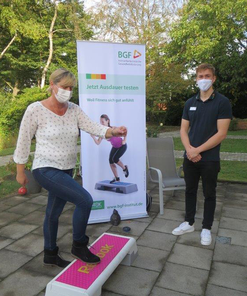 So konnten die Mitarbeiter*innen zum Beispiel klassisch ihren Blutdruck messen lassen, darüber hinaus wurden aber auch Ausdauer und Leistungsfähigkeit anhand der Alltagsbewegung getestet. Ein Koordinationsparcour bot die Möglichkeit, Gleichgewicht und koordinative Fähigkeiten zu checken. Eine Messung der Herzratenvariabilität gab Auskunft über das aktuelle Stressniveau. Wer wollte, konnte sich dann abschließend am Infostand der AOK über regionale Gesundheitsangebote und zum Thema Krankenversicherung beraten lassen.