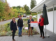 Spendenübergabe nur auf der Terrasse: Drei Vertreterinnen der Ortsgemeinde Girkenroth haben eine Spende in Höhe von 970 Euro an das Hospiz St. Thomas in Dernbach überreicht. Corona-bedingt nahm Hospizleiterin Eva-Maria Hebgen den Spendenscheck von der Girkenrother Ortsbürgermeisterin Claudia Schmidt, Gemeinderatsmitglied Gudrun Schmidt und Anja Menges als Vertreterin aller am Weihnachtsmarkt beteiligten Gruppen im Außenbereich des Hospizes und mit dem nötigen Sicherheitsabstand entgegen.