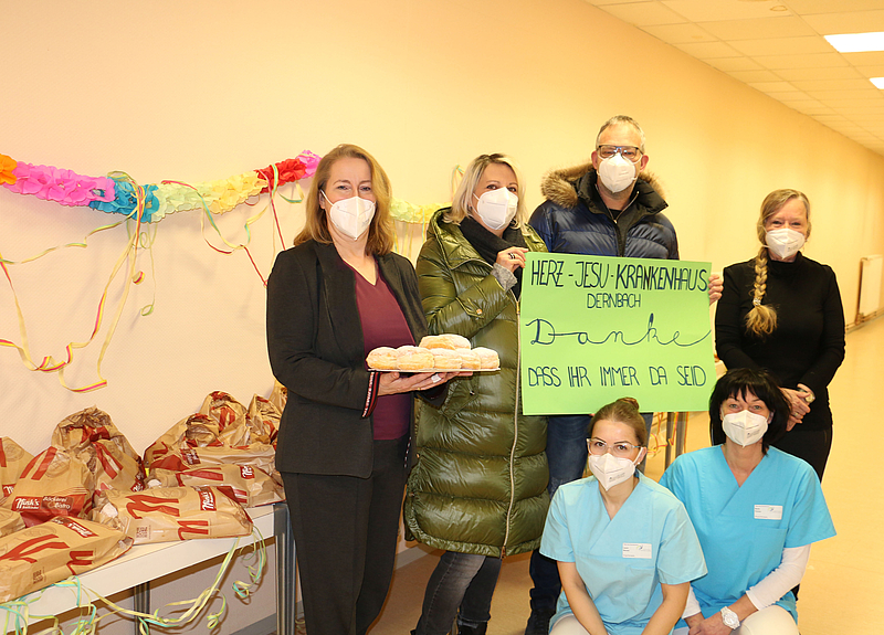 Die Gebäckstücke nahmen Astrid Eisenberg, Pflegedirektorin des Dernbacher Krankenhauses, sowie Beate Pohl als Vorsitzende der Mitarbeitervertretung (MAV) entgegen. „In der Corona-Krise war der Zusammenhalt unter unseren Mitarbeiterinnen und Mitarbeitern essenziell für die Bewältigung aller Herausforderungen“, würdigte Astrid Eisenberg die Leistung der Krankenhausbelegschaft. „Umso schöner ist, dass der Einsatz unserer Mitarbeiterinnen und Mitarbeiter auch außerhalb des Krankenhauses solche Anerkennung findet.“