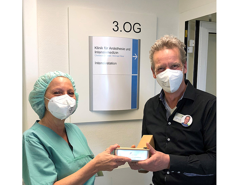 Auch in diesem Jahr ging es für das Team der Pflegedirektion Tim Plaggenborg, Matthias Dworaczek und Assistentin Marina Scholl bereits am Vormittag auf in die einzelnen Stationen und Funktionseinheiten. Mit im Gepäck jede Menge alufarbene Lunchboxen mit praktischem Verschluss in Form eines Holzbretts, welches auch als Schneidebrett für Obst und Gemüse Einsatz finden kann. „Neben der Geschenkübergabe ist mir vor allem ein kurzes persönliches Gespräch wichtig – und dass ich die Möglichkeit habe, ganz persönlich „Dankeschön“ zu sagen,“ erklärt Pflegedirektor Plaggenborg.