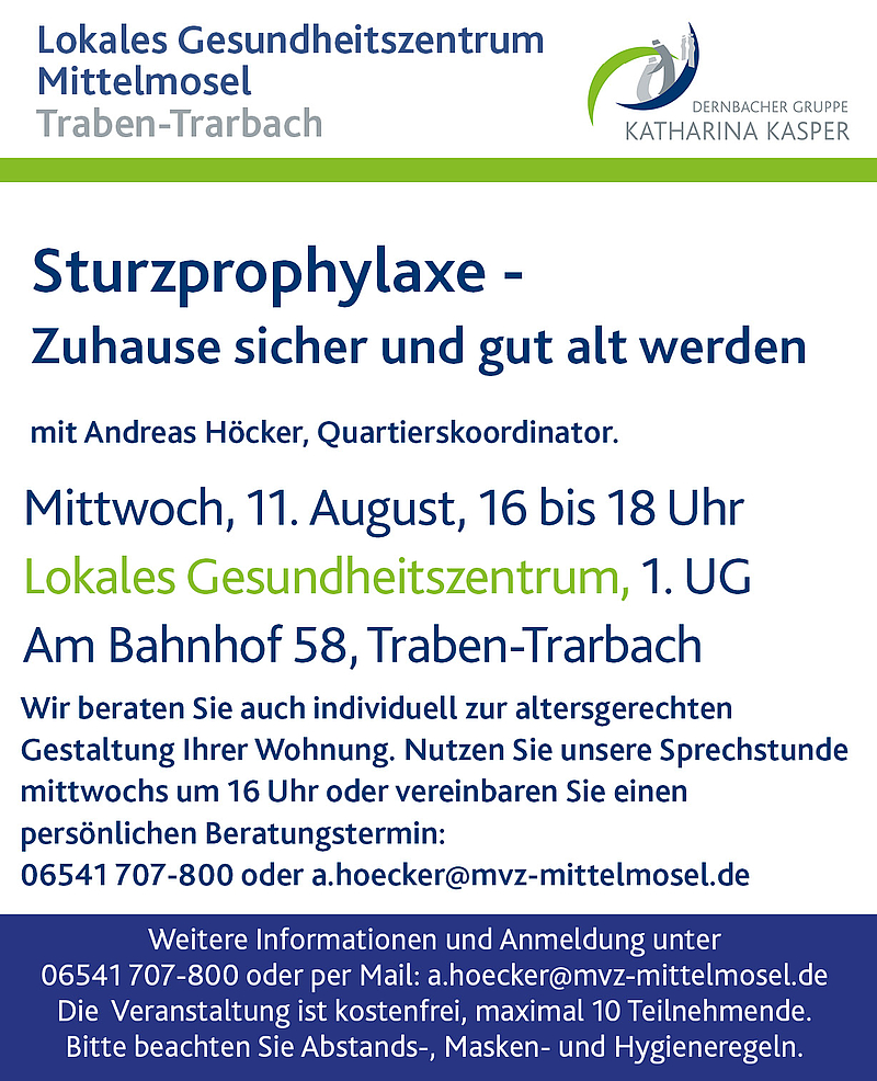Corona-bedingt können maximal 10 Personen den Vortrag besuchen. Bitte melden Sie sich per Mail unter a.hoecker(at)mvz-mittelmosel oder telefonisch unter 06541 707-800 an. Wir freuen uns, Sie dort begrüßen zu dürfen!