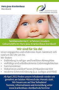 Das Herz-Jesu-Krankenhaus freut sich, dass die Infoveranstaltungen der Geburtshilfe wieder stattfinden können. Regelmäßig am letzten Mittwoch des Monats (außer Dezember) informiert das Team der Geburtshilfe über die Möglichkeiten zur Entbindung in Dernbach.