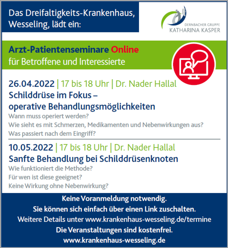 Mehr über die operativen Behandlungsmöglichkeiten erfahren Schilddrüsenpatientinnen und -patienten im Online-Seminar mit Schilddrüsenexperte Dr. med. Nader Hallal, der als Facharzt für Chirurgie, Viszeralchirurgie und spezielle Viszeralchirurgie das Zentrum für Schilddrüsenerkrankungen am Wesselinger Dreifaltigkeits-Krankenhaus leitet. Seit rund einem Jahr ist er zudem als Oberarzt der Klinik für Allgemein- und Viszeralchirurgie am Herz-Jesu-Krankenhaus Dernbach tätig.