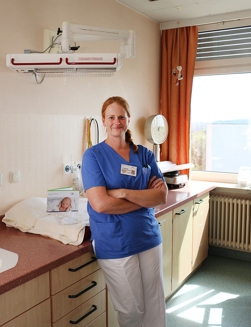 Ehe die Kamera klickt, rückt Hebamme Susanne die Grußkarte für frischgebackene Eltern zurecht. In der Geburtshilfe des Herz-Jesu-Krankenhauses, wo die 42-Jährige seit einigen Monaten arbeitet, achtet sie auf jedes Detail. Nach vielen Jahren in der Pflege folgt die ausgebildete Hebamme und Gesundheits- und Krankenpflegerin hier wieder ihrem Herzenswunsch.