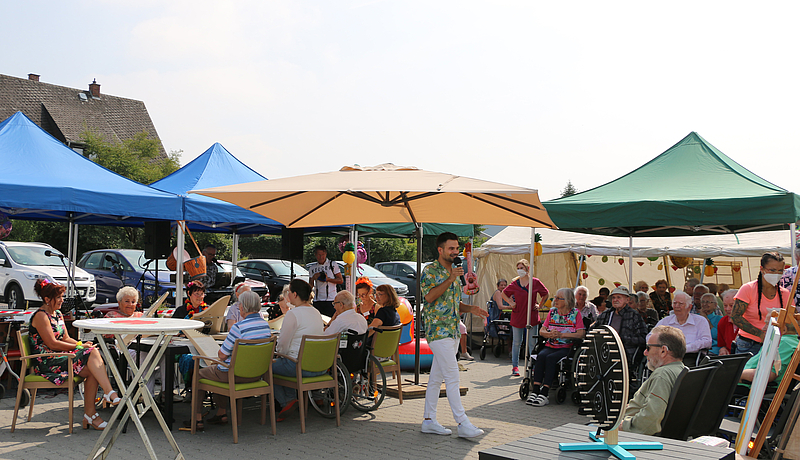 Mit einer kurzen Rede hieß Einrichtungsleiter Deniz Cevik zu Beginn die zahlreichen Bewohner*innen, Angehörigen, Nachbar*innen und anderen Gäste willkommen. „Wegen des C-Wortes, das niemand mehr hören will“, sei dies sein erstes großes Fest als Leiter des Seniorenzentrums, so Deniz Cevik. Diese Gelegenheit wolle er nun nutzen und Danke sagen an die Mitarbeiter*innen und ehrenamtlichen Helfer*innen des Seniorenzentrums, die jederzeit für die Bewohner*innen da seien. Für das Sommerfest halfen viele von ihnen an der Strandbar aus, bemannten die Kuchentheke und übernahmen die Eintrittskontrolle mit Teststation. Mitglieder des im vergangenen Jahr gegründeten Fördervereins kümmerten sich um die Kasse.