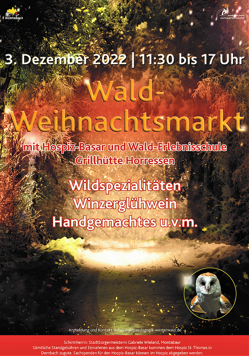 Mit Wildspezialitäten, Winzerglühwein und Handgemachtem hält der Wald-Weihnachtsmarkt, was der Name verspricht. Besucher können nicht nur Schlemmen und sich auf den Ständen voller Ideen fürs Weihnachtsfest inspirieren lassen, sondern auch die Wald-Erlebnisschule kennenlernen. Die Idee und Initiative, einen Wald-Weihnachtsmarkt zugunsten des Hospiz St. Thomas zu veranstalten, kommt von Victoria Mayer, Waldpädagogik Westerwald. „Für die wundervolle Initiative möchte ich mich bei Frau Mayer ganz herzlich bedanken. Der Hospiz-Basar hätte in keinem schöneren Rahmen stattfinden können,“ freut sich Eva-Maria Hebgen, Leiterin des Hospizes. „Die Standgebühren und die Einnahmen aus dem Hospiz-Basar kommen dem Hospiz zugute, darum hoffen wir auf viele Anmeldungen und natürlich auch auf viele Besucher“, erklärt Victoria Mayer, die sich ganz besonders freut, dass Montabaurs Stadtbürgermeisterin Gabriele Wieland die Schirmherrschaft für die Veranstaltung übernommen hat. „Gefragt sind liebevoll bunt Genähtes, Gestricktes und Gehäkeltes, aber auch viele weitere selbstgemachte Dinge“, erzählt Eva-Maria Hebgen. Sachspenden für den Basar können ab sofort im Hospiz St. Thomas in Dernbach, Rheinstraße 9a, vorbeigebracht werden. „Durch den Verkauf von Sachspenden können wir im Hospiz viel Gutes für unsere Gäste tun, darum möchte ich mich schon im Voraus im Namen des Teams und dem unserer Gäste für Ihre Sachspenden ganz herzlich bedanken.“