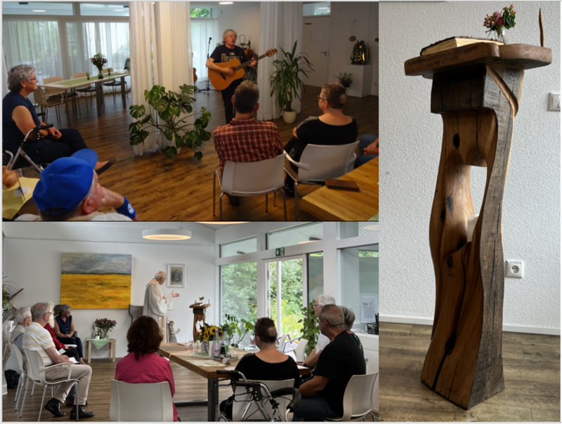 Die Zeremonie fand am 15.08.2023 um 15:00 Uhr im Gemeinschaftssaal des St. Thomas Hospizes in Dernbach statt. Pater Elmar Busse hat die Stele in Anwesenheit von Heimleiterin Eva-Maria Hebgen, Freunden, Angehörigen und Gästen mit einer ergreifenden Zeremonie eingeweiht. In seiner Predigt hob Pater Busse die Bedeutung des Gedenkens und der Erinnerung – auch mit Verweis auf das hohe Gut der Religionsfreiheit –hervor. Die aus Balkengehölz des Dachstuhls des Westerwälder Doms geschaffene Stele ist Rita Wagner, ehemals Gast im Hospiz und dort verstorben, gewidmet. „Frau Wagner“, so erinnert sich Hospizleiterin Eva-Maria Hebgen nach der kleinen Andacht, „war eine taffe Frau, die dem betreuenden Team gegenüber große Dankbarkeit verspürte.“ Dank an die Eheleute Eger sowie den Hospizverein Montabaur für die Organisation und Abwicklung.