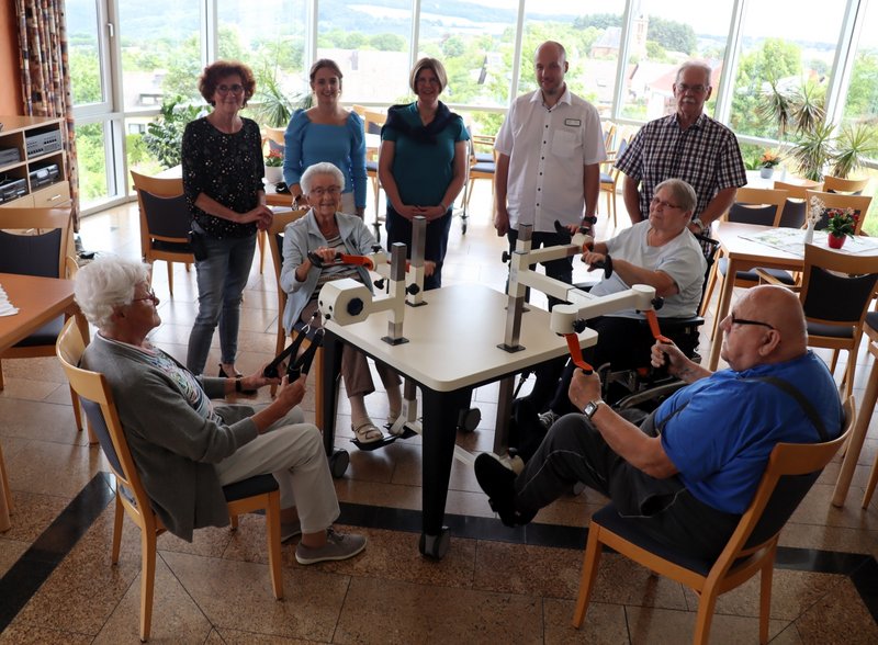 Ob Fahrrad fahren, Drehorgelspielen, Kaffeemühle mahlen oder die Nähmaschine antreiben – am Plaudertisch ist das für die Bewohner und Bewohnerinnen der Einrichtung jetzt alles an einem Tisch möglich. Der neue Tisch trägt dazu bei, dass die Bewohner regelmäßig Sport treiben, es werden Arme, Beine, und Oberkörper in altersgemäßer Form trainiert. „Eine großartige Sache, miteinander Plaudern und dabei was für den Körper tun“, lobte Heimleiter Chris Martin die neue Anschaffung.