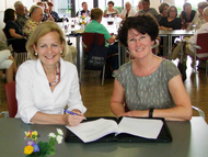 Zum Bild: Annette Lehmann, Malteser Hilfsdienst e. V. Stadtgeschäftsstelle Frankfurt, und Ines Kotschka, Leitung Seniorenzentrum St. Josefshaus, unterzeichnen den Kooperationsvertrag.